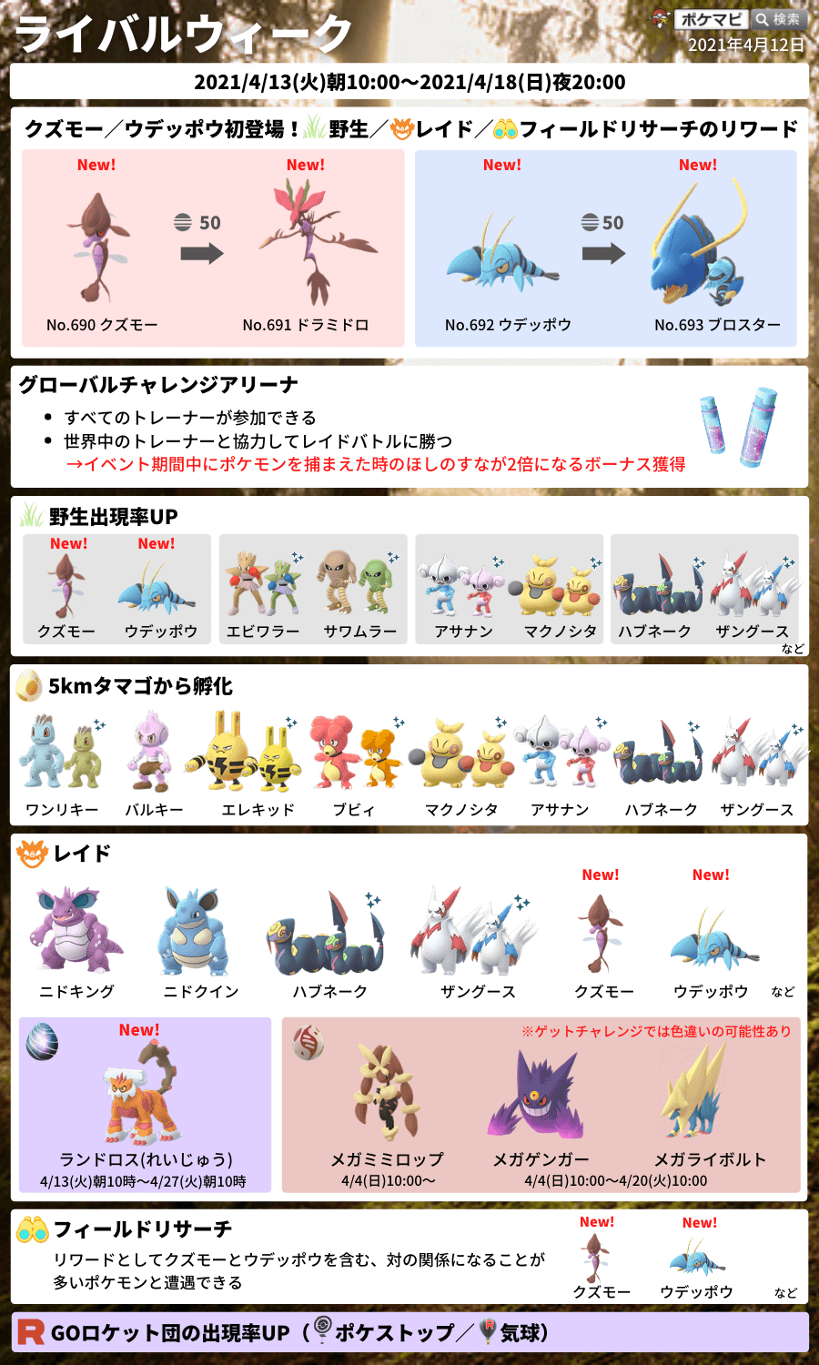 ট ইট র ポケモンgo攻略情報 ポケマピ ライバルウィークの詳細が発表されました 初登場のポケモン クズモー ドラミドロ ウデッポウ ブロスター れいじゅうランドロス 期間 日本時間21年4月13日 火 朝10時 21年4月18日 日 夜時まで